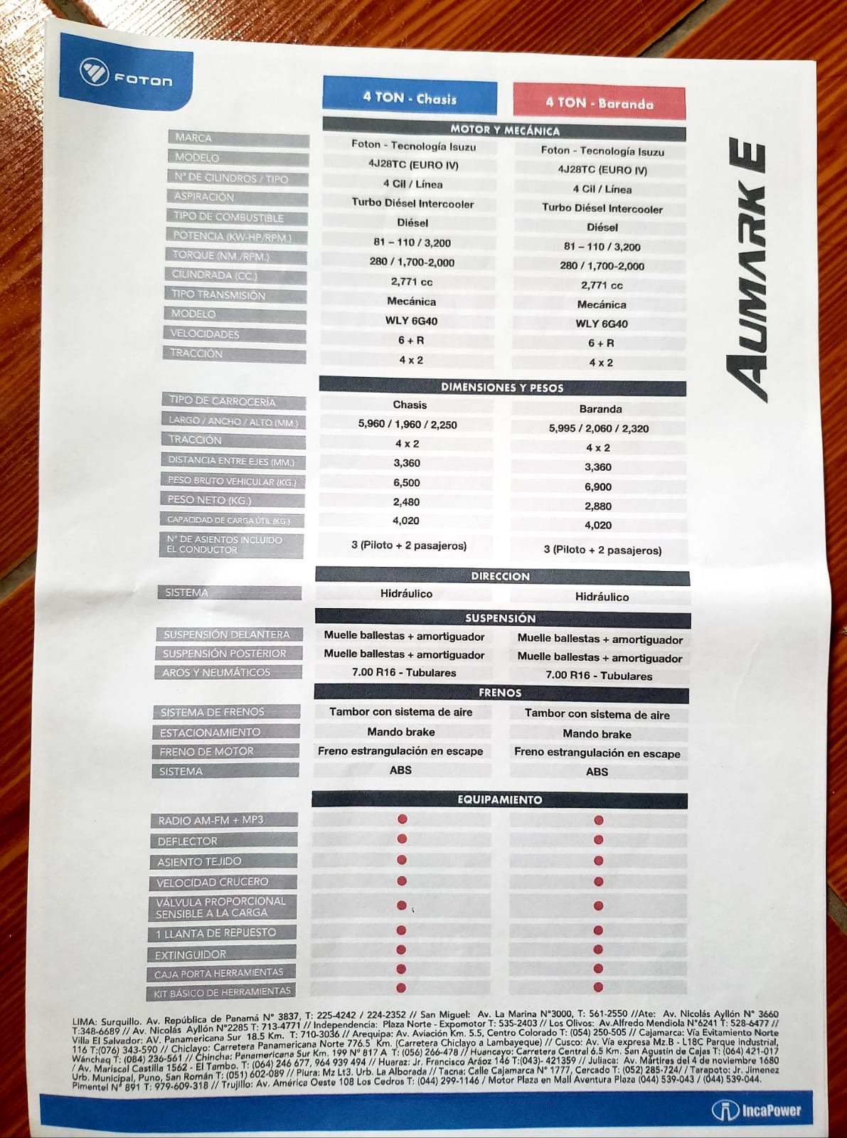 - MARCA : FOTON (TECNOLOGÍA ISUZU), TIPO : MECÁNICA